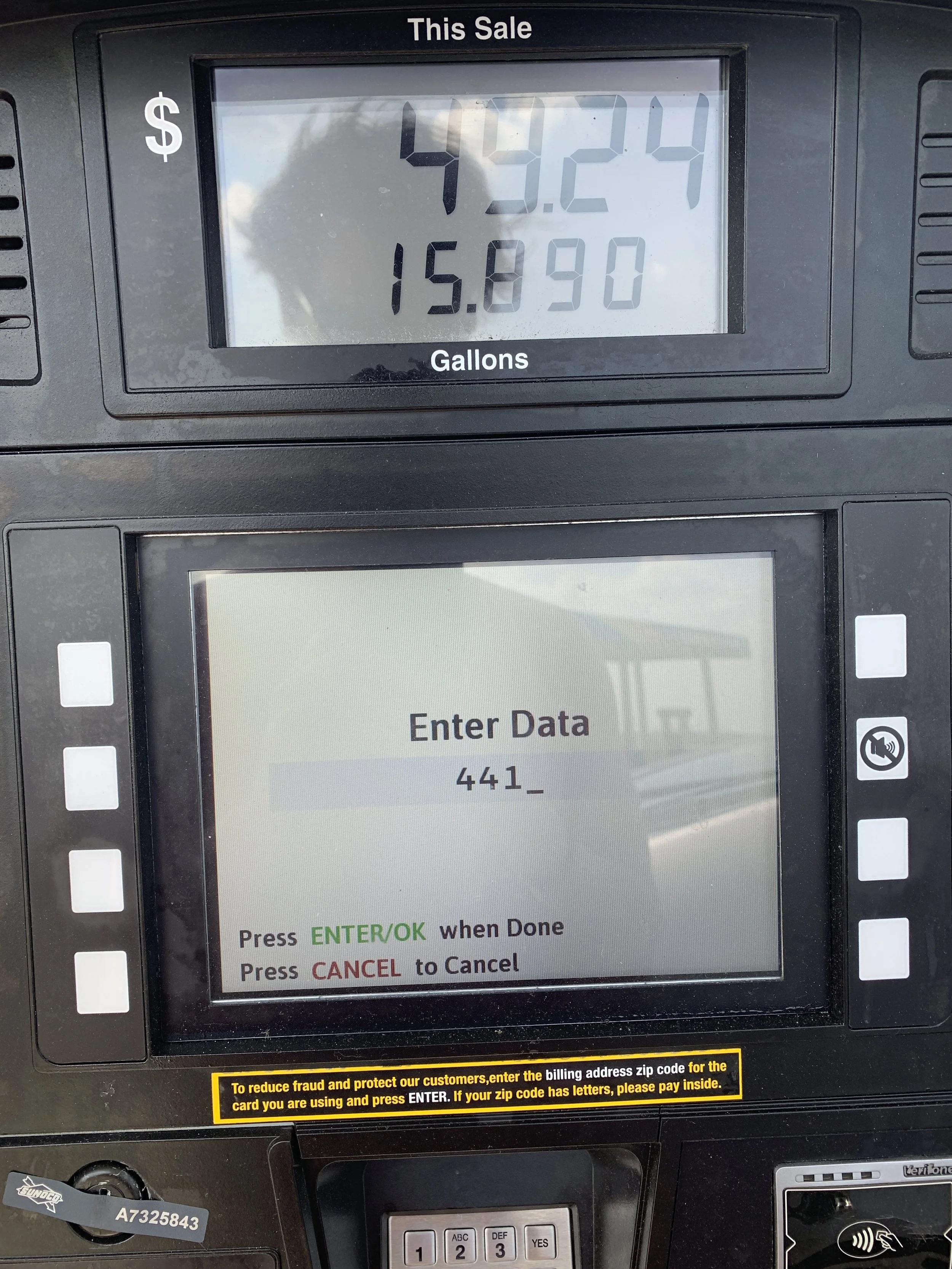 Upon closer inspection of the image, there was a yellow label under the interface that instructed visitors to enter their billing zip code. Didn’t see this at the time, but led to more questiuons - was this “enter data” an intentional design decision? or, perhaps a poorly designed error state? Will never know why this interface was the way it was, or if the sticker put there was seriously meant to clarify what data the machine was asking for. Even with the yellow border pulling it up in the hierarchy, many people would miss it. Who knows?
