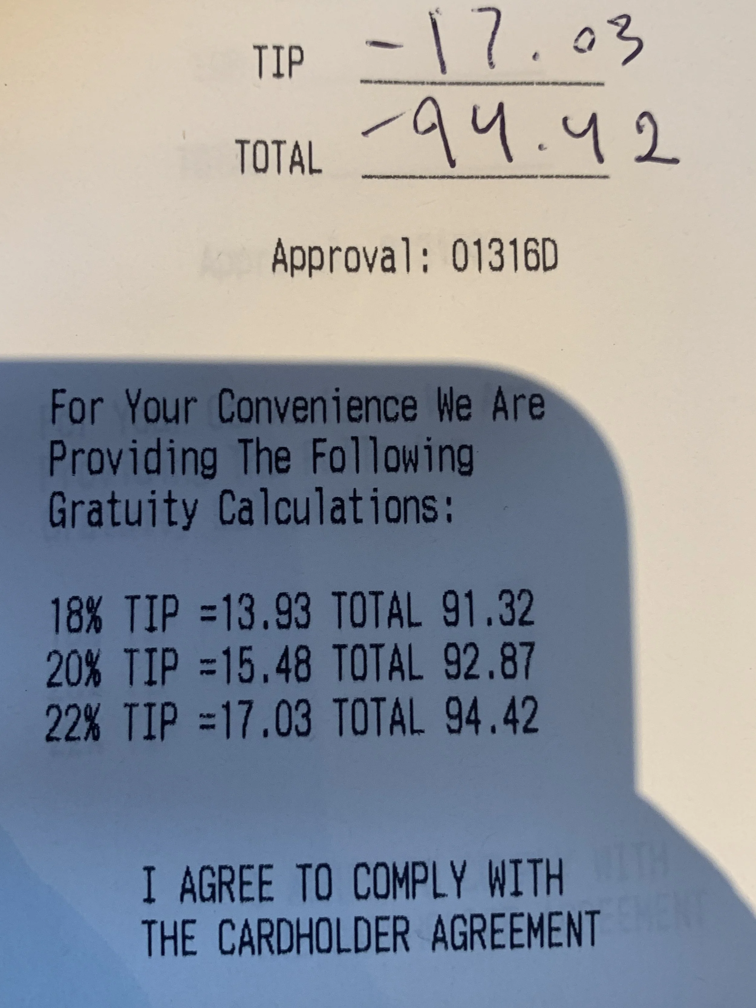 We were sitting down at a restaurant and upon receiving a receipt for our stay were given a receipt. The receipt had everything you would expect- a field for a tip, total, and signature. For anyone who has ever struggled with figuring out what to leave as a tip, the receipt also included a tip calculator to make it very easy to calculate a tip. What I found interesting about this restaurant was that rather than the usual 15%/20%/25% tip bands that some might call conventional, this receipt included 18%/20%/22%. If I had to guess why, it’s to constrain the options available to the customers so that the server would at least get an 18% tip, which is significantly more than 15% depending on the bill. Granted the 25% is removed as well, so the server would be less likely to achieve that level of tip. As a customer I am usually evaluting my experience and spending time fumbling with a tip depending on the level of service I got. In this case it made it very easy to select an option- of which I selected 22%. It’s not 25% which I usually reserve for special occasions, but 22% still felt like a good fit. In the end, the server got the highest tip on the list.
